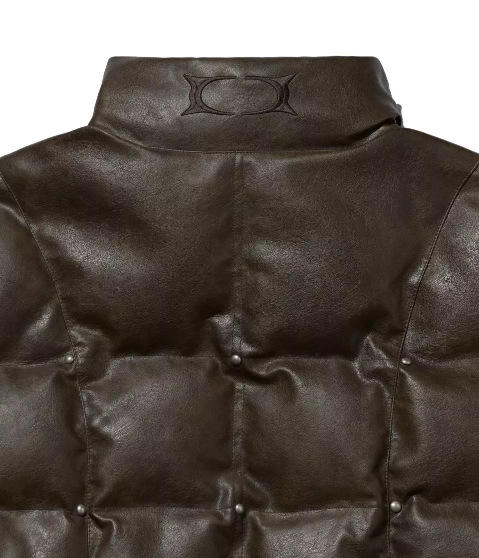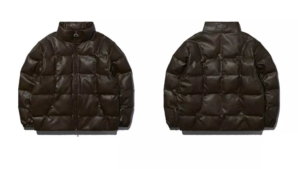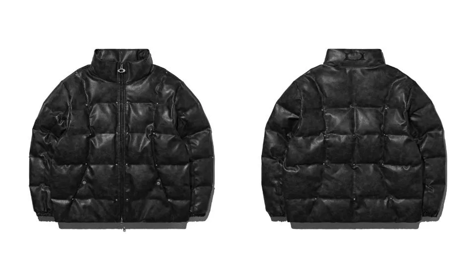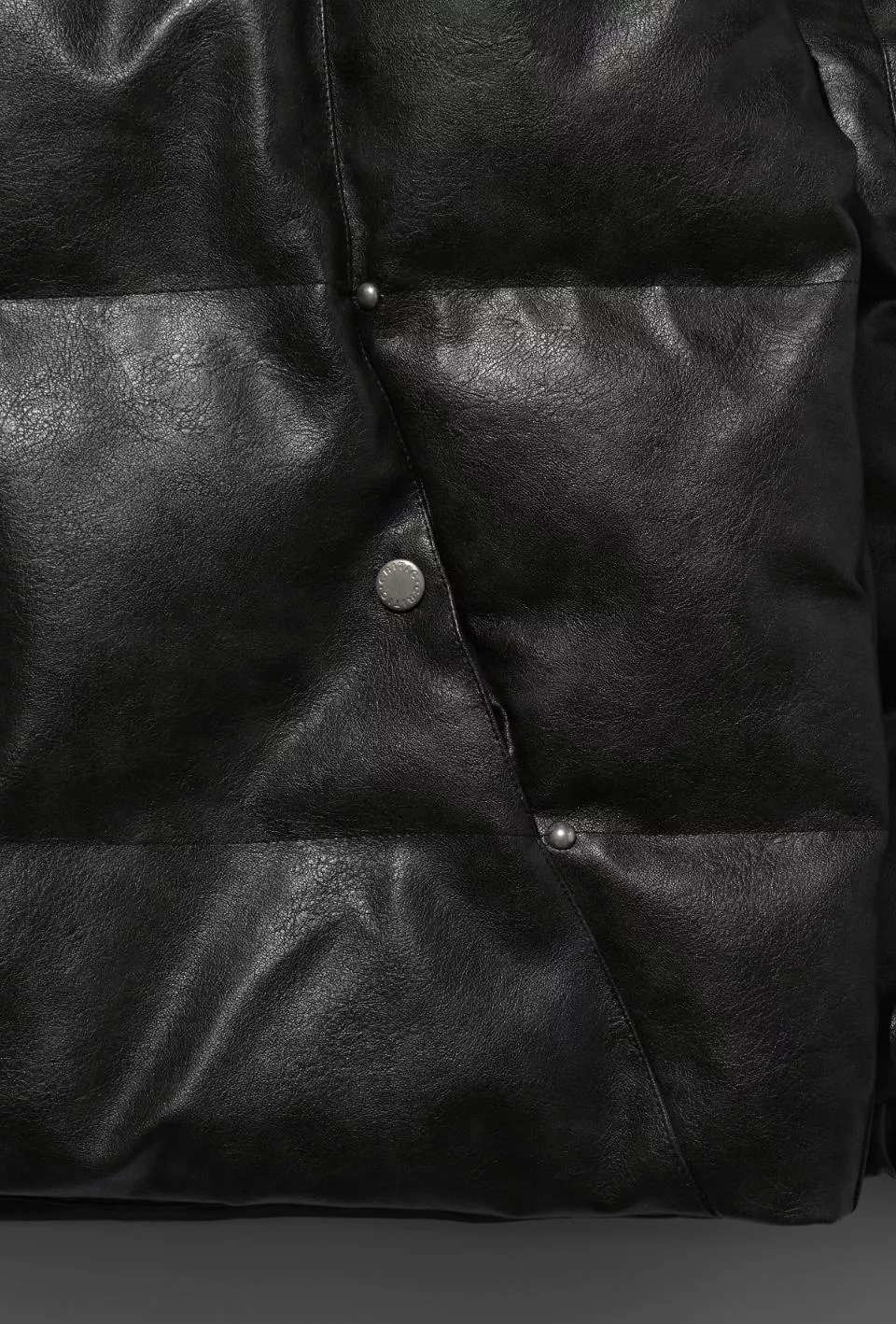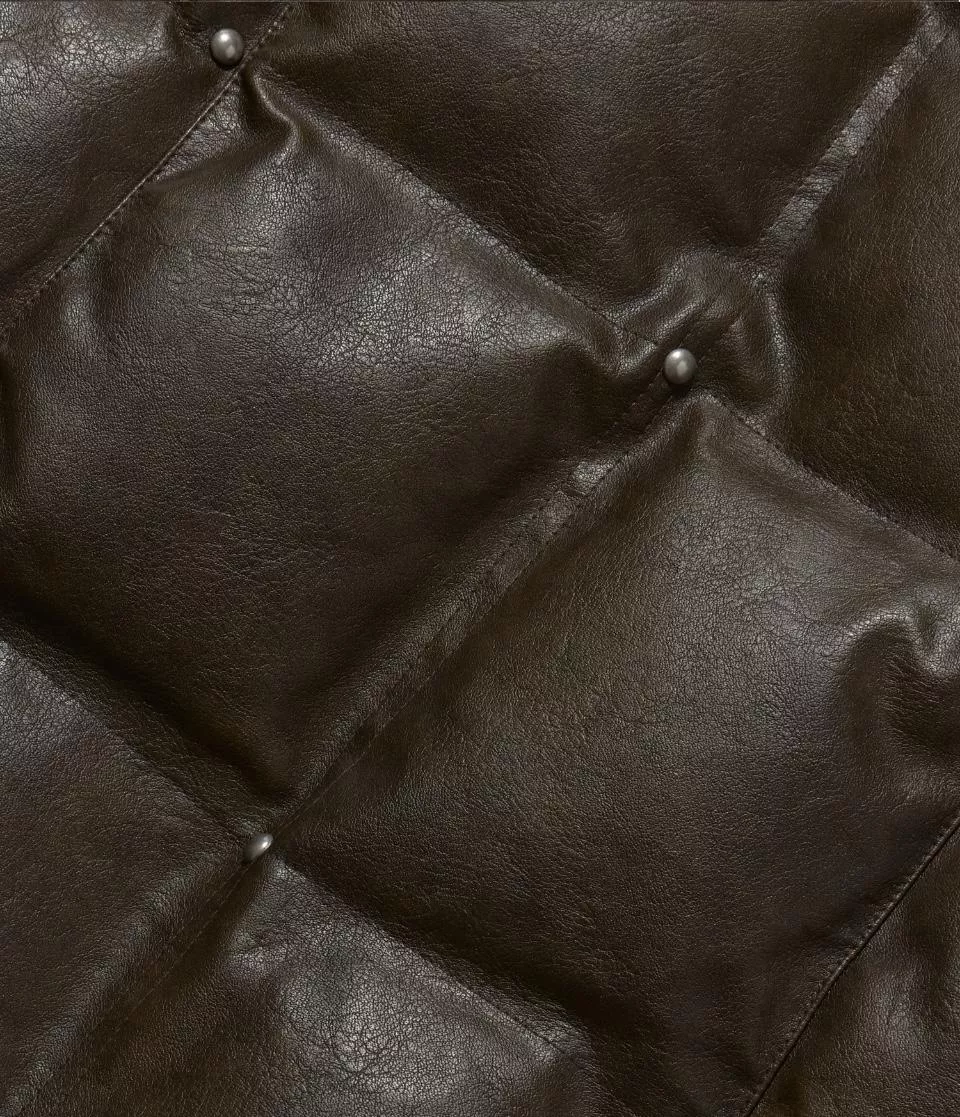 這是一件帶有人造皮革光澤感的顏色和飾釘細節的鋪棉外。