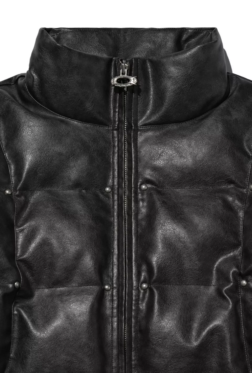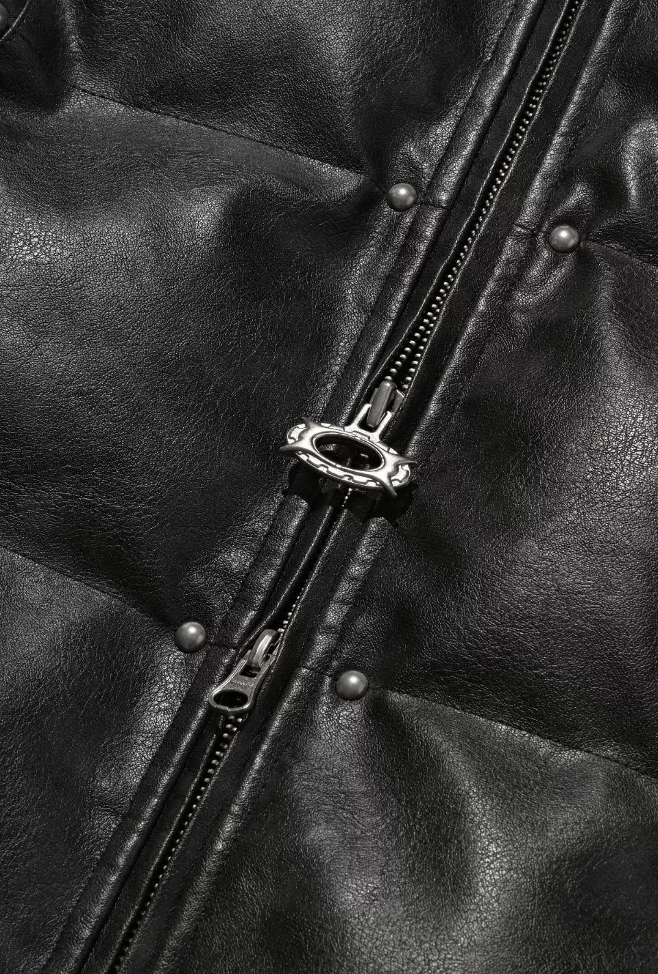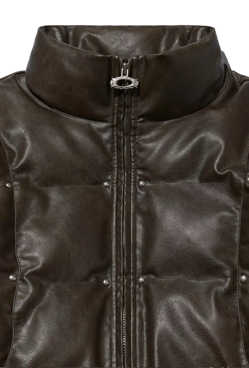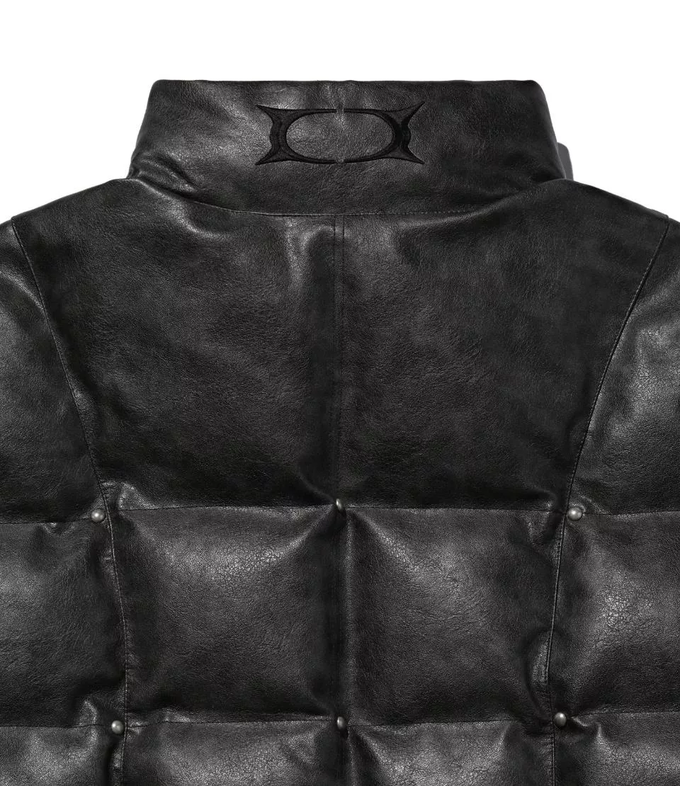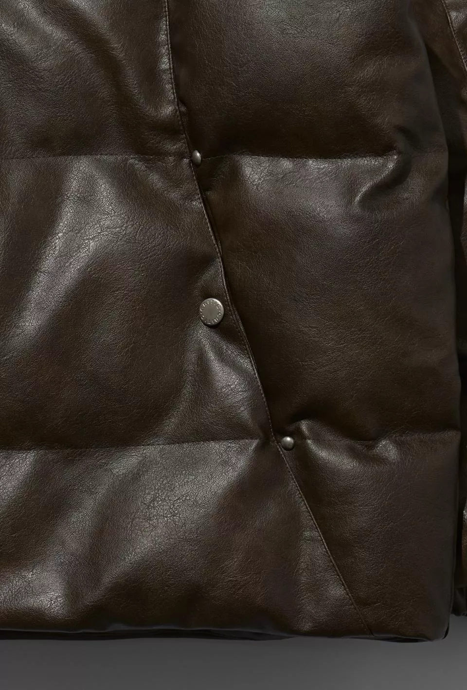 這是一件帶有人造皮革光澤感的顏色和飾釘細節的鋪棉外。