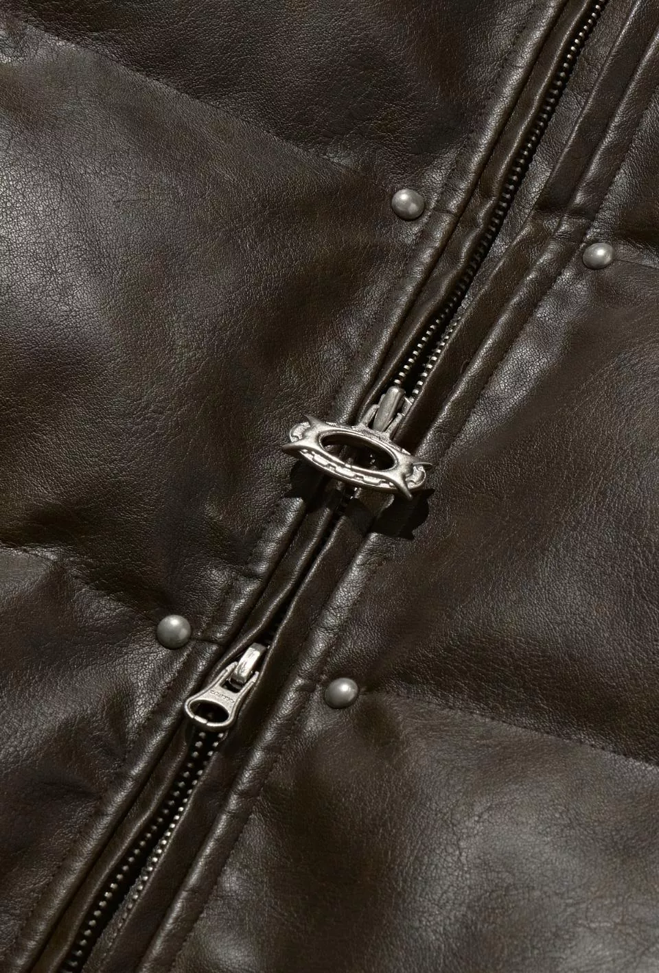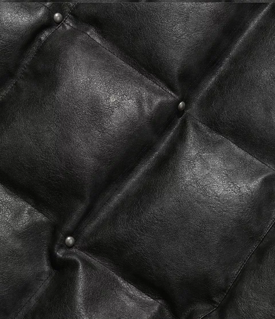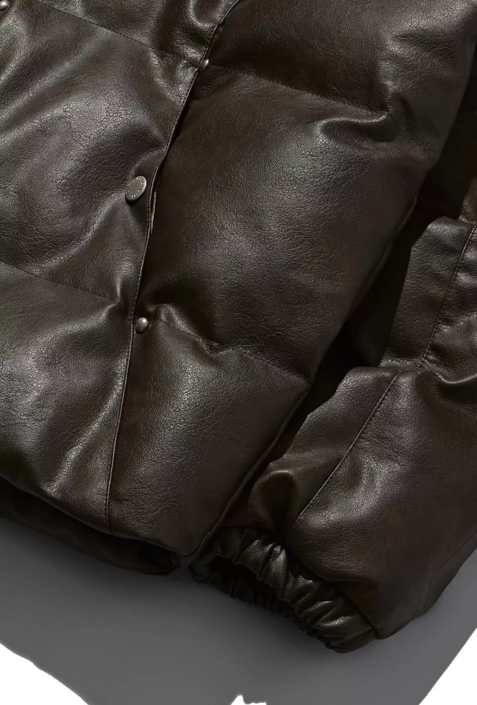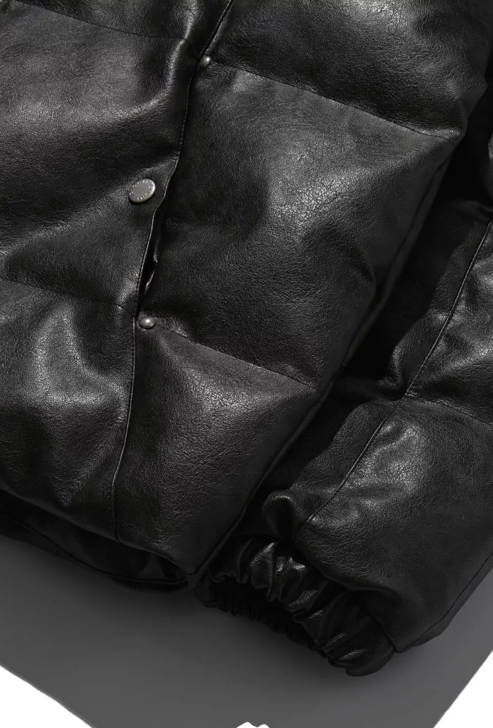 這是一件帶有人造皮革光澤感的顏色和飾釘細節的鋪棉外。