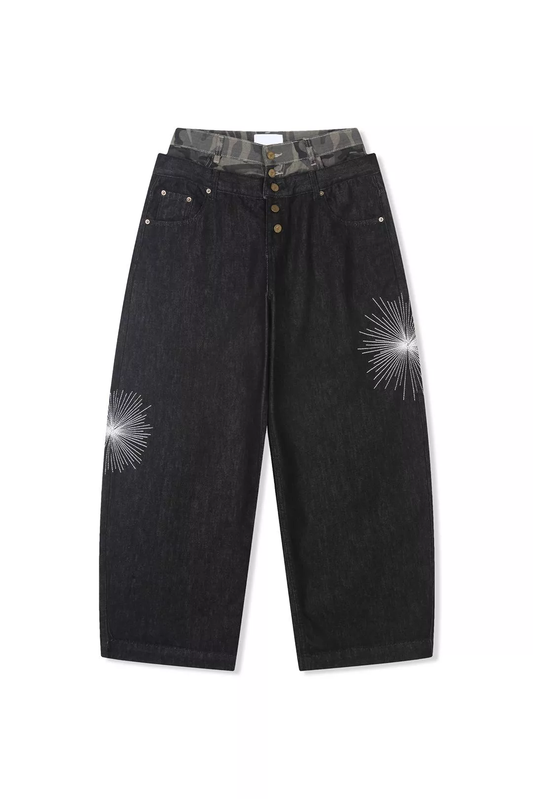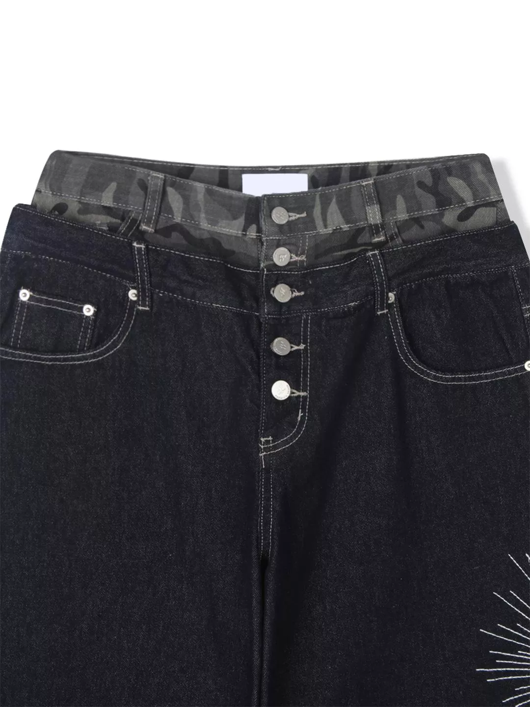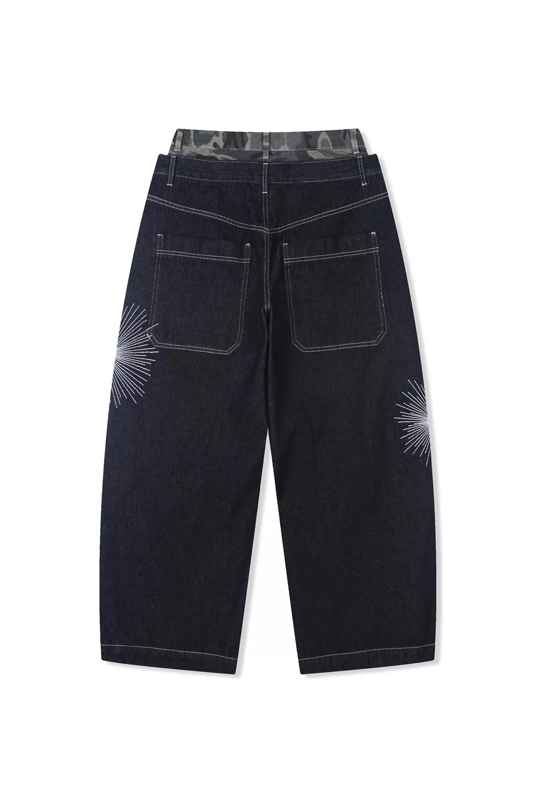褲腿處帶有星芒刺繡細節並結合了迷彩圖案的腰部拼接結構