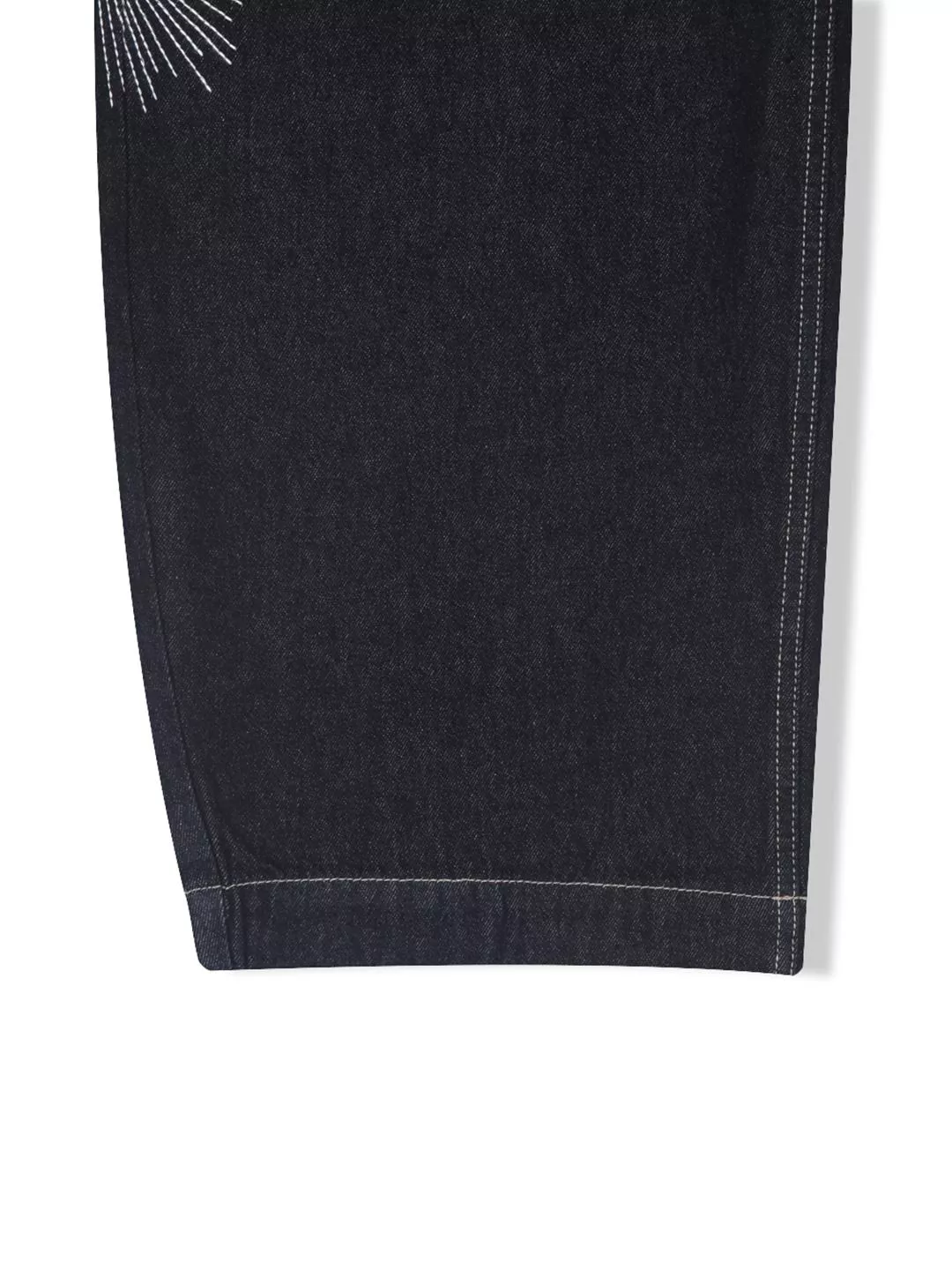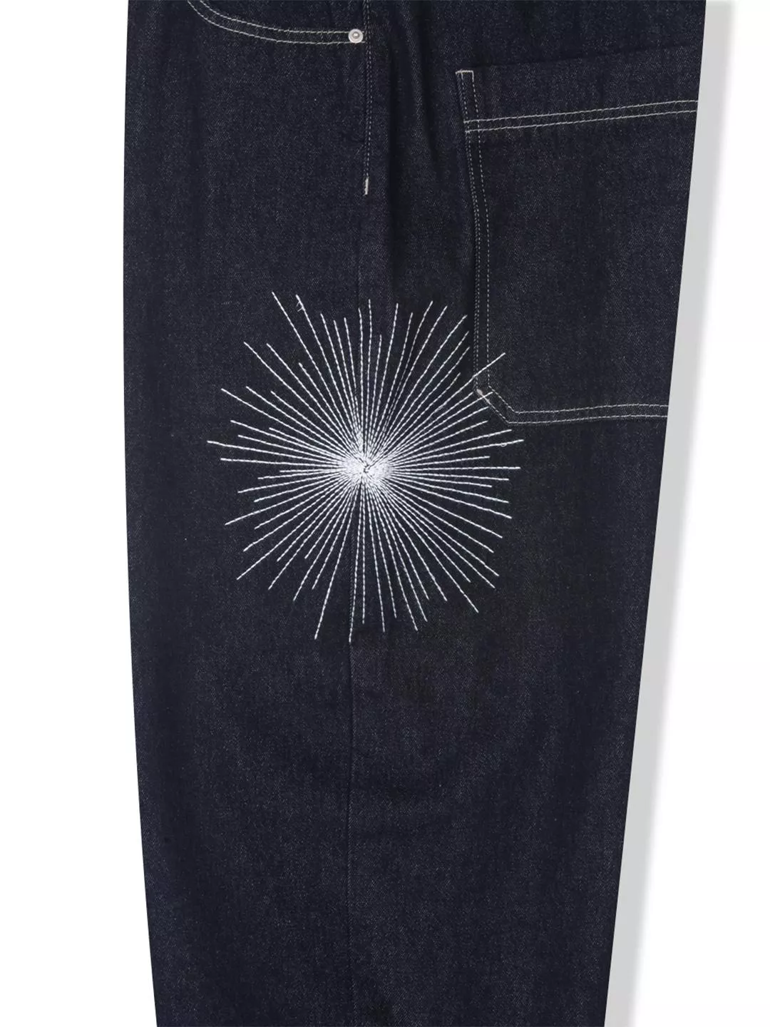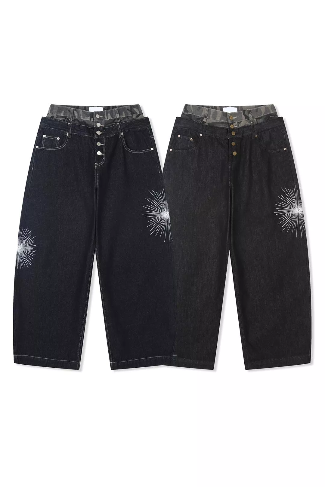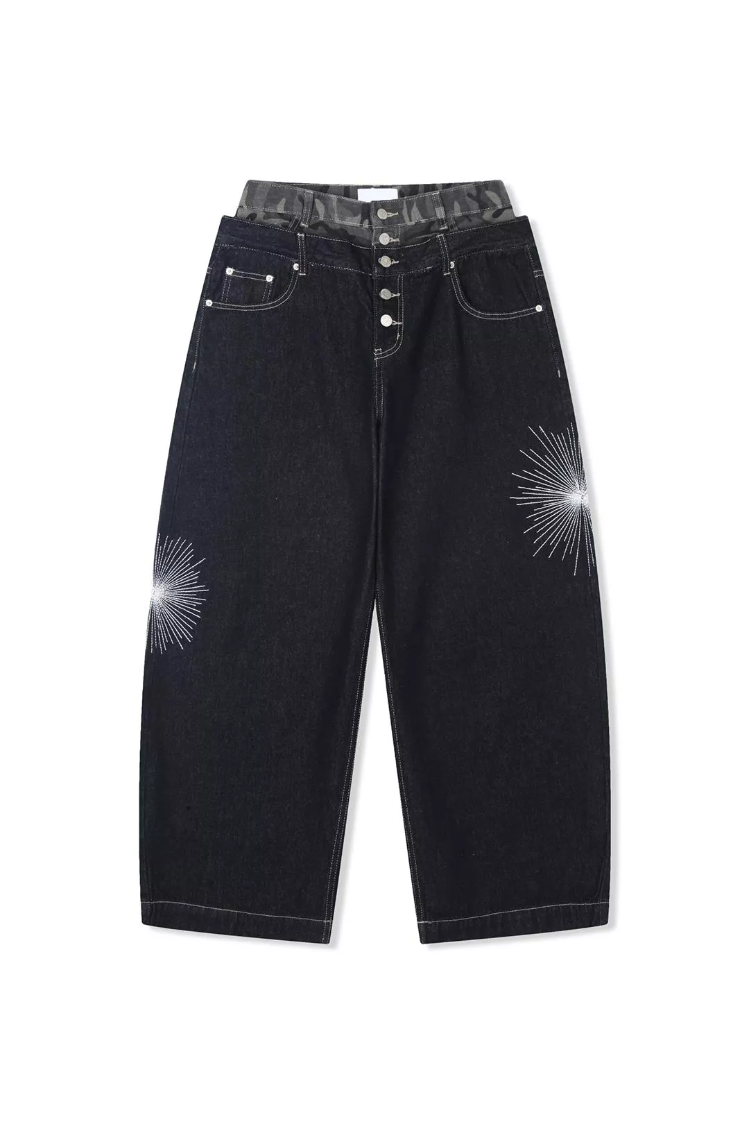 褲腿處帶有星芒刺繡細節並結合了迷彩圖案的腰部拼接結構