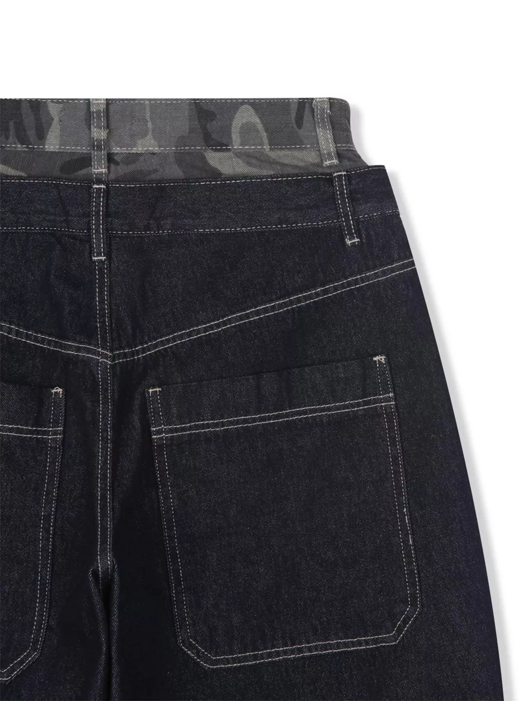 Raucohouse Deep Indigo Camo Sagging Denim Pants迷彩腰部拼接垂墜牛仔褲